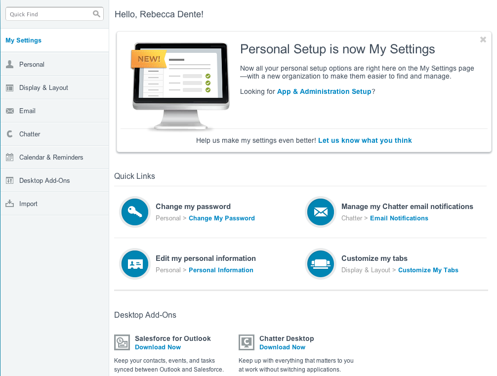 - Personal Setup - On the podcast, we briefly discussed the new admin setup menu, but there's a ton that's coming to your end users as well. And it's important for you to familiarize yourself with these changes, because guiding your users on how to grant login access or change their Chatter email settings has all changed. The new setup is fantastic and makes a lot of sense, but as an admin, take the time to click around in there & get comfortable with the new UI.
